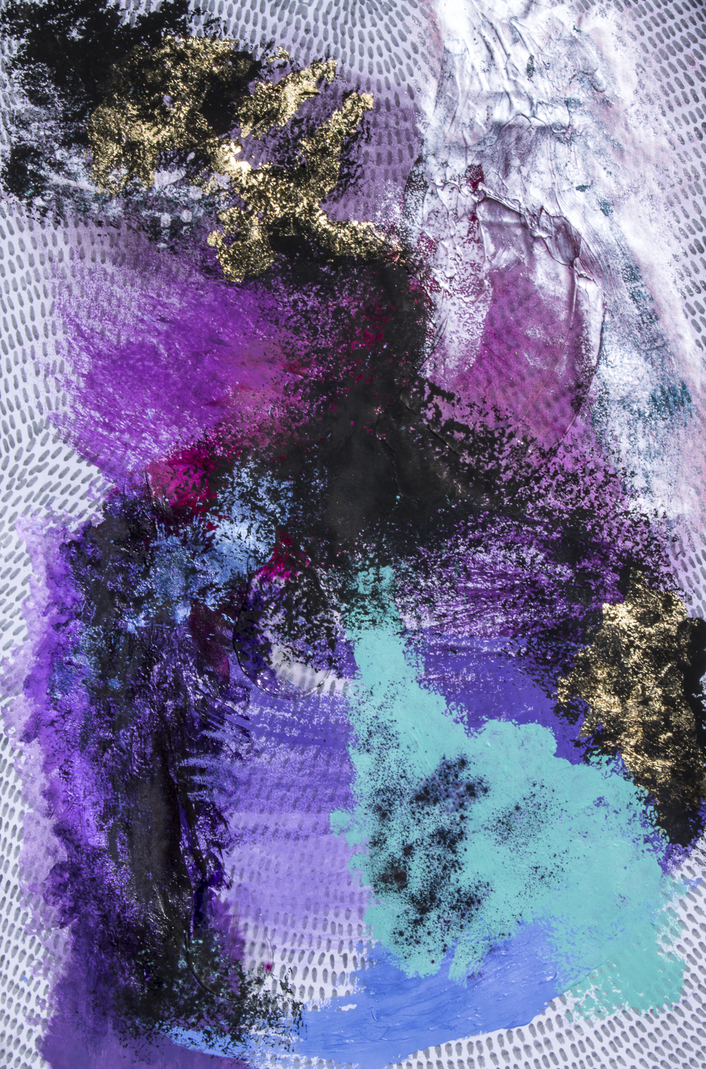 acrylic, ink, pastel, gold leaf, oil stick on paper